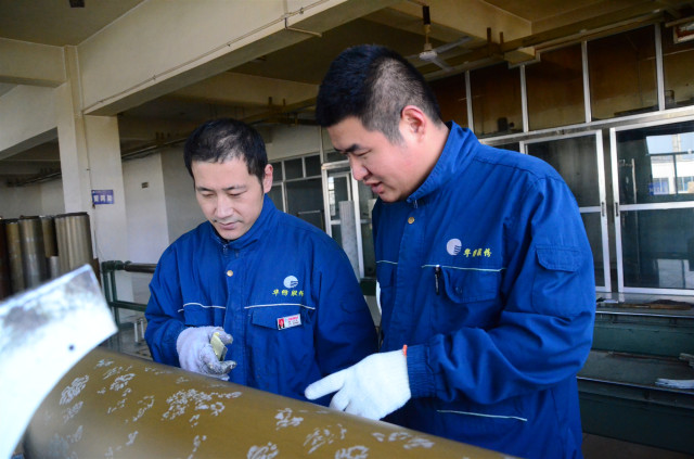 圖為花布車間制網(wǎng)工序的張海亮(左)與張彬彬在安裝悶頭前,再次查看驗(yàn)證鎳網(wǎng)質(zhì)量。
