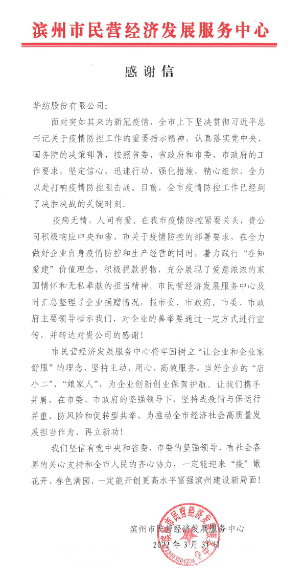 “疫病無情,人間有愛。在我市疫情防控緊要關(guān)頭,貴公司積極響應(yīng)中央和省、市關(guān)于疫情防控的部署要求,在全力做好企業(yè)自身疫情防控和生產(chǎn)經(jīng)營的同時,著力踐行‘在知愛建’價值理念,積極捐款捐物,充分展現(xiàn)了愛意濃濃的家國情懷和無私奉獻的擔(dān)當(dāng)精神……”這是3月31日濱州市民營經(jīng)濟發(fā)展服務(wù)中心發(fā)給公司感謝信中的一段話。