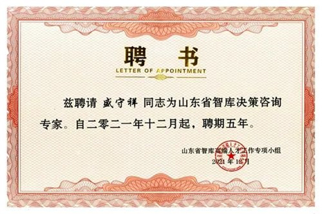 導(dǎo)讀:近日,接山東省智庫高端人才工作專項(xiàng)小組辦公室通知,公司董事長盛守祥入選2021年山東省智庫高端人才,獲聘經(jīng)濟(jì)建設(shè)領(lǐng)域山東省智庫決策咨詢專家。