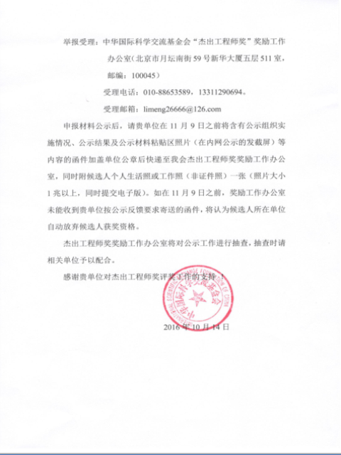 2、關(guān)于做好中華國際科學(xué)交流基金會(huì)“杰出工程師獎(jiǎng)”獲獎(jiǎng)候選人公示工作的通知