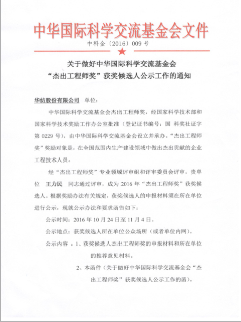 經(jīng)“杰出工程師獎(jiǎng)”專業(yè)領(lǐng)域評審組和評審委員會(huì)評審,華紡股份有限公司王力民同志通過評審,成為2016年“杰出工程師獎(jiǎng)”獲獎(jiǎng)候選人。根據(jù)獎(jiǎng)勵(lì)辦法有關(guān)規(guī)定,獲獎(jiǎng)候選人的申報(bào)材料需所在單位進(jìn)行公示。公示如下: