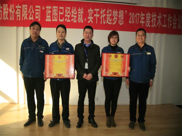 2016年,公司以技術(shù)創(chuàng)新、技術(shù)進(jìn)步為帶動(dòng),持續(xù)推進(jìn)精益化生產(chǎn)和標(biāo)準(zhǔn)化操作與管理。技術(shù)委員會(huì)以技術(shù)人員的綜合素質(zhì)提升為重點(diǎn),進(jìn)一步強(qiáng)化了技術(shù)人員的選拔、培養(yǎng)與激勵(lì),優(yōu)化了技術(shù)隊(duì)伍的知識(shí)結(jié)構(gòu)和專(zhuān)業(yè)技能,公司整體技術(shù)創(chuàng)新能力與水平得到顯著提高。在公司2016年技術(shù)人員打單色樣、大小樣差距實(shí)驗(yàn)、拼色樣、打樣技能等一系列競(jìng)賽評(píng)比工作中,涌現(xiàn)出一批表現(xiàn)突出的技術(shù)人員。為此,公司技術(shù)委員會(huì)根據(jù)相關(guān)評(píng)比原則及條件,評(píng)比出單色樣、打樣技能方面團(tuán)體獎(jiǎng)2個(gè),獲獎(jiǎng)技術(shù)人員29名。總經(jīng)理閆英山為優(yōu)秀團(tuán)隊(duì)頒發(fā)獎(jiǎng)狀,總工程師羅維新為獲獎(jiǎng)的專(zhuān)業(yè)技術(shù)人員頒發(fā)榮譽(yù)證書(shū)。