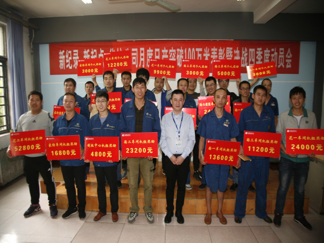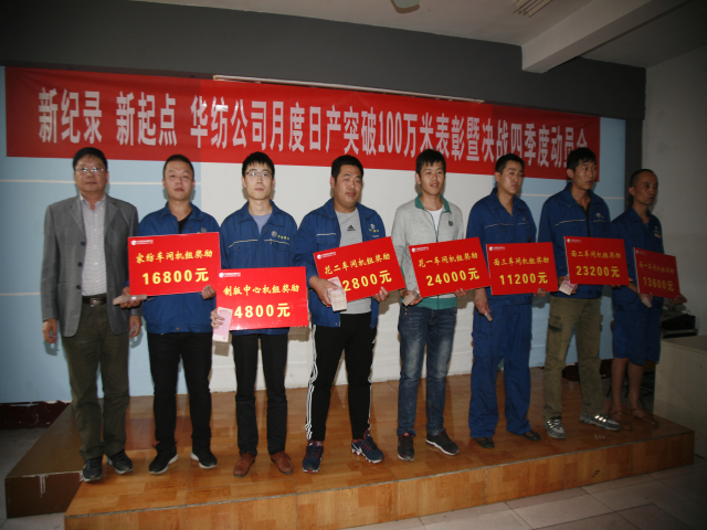 10月11日,公司召開主題為“新紀(jì)錄,新起點(diǎn),華紡公司月度日產(chǎn)突破100萬米表彰暨決戰(zhàn)四季度動(dòng)員會”,會上對在9月份印染生產(chǎn)計(jì)劃完成工作中成績優(yōu)異的55個(gè)機(jī)組和41位個(gè)人進(jìn)行了表彰獎(jiǎng)勵(lì),對第四季度工作進(jìn)行了部署。