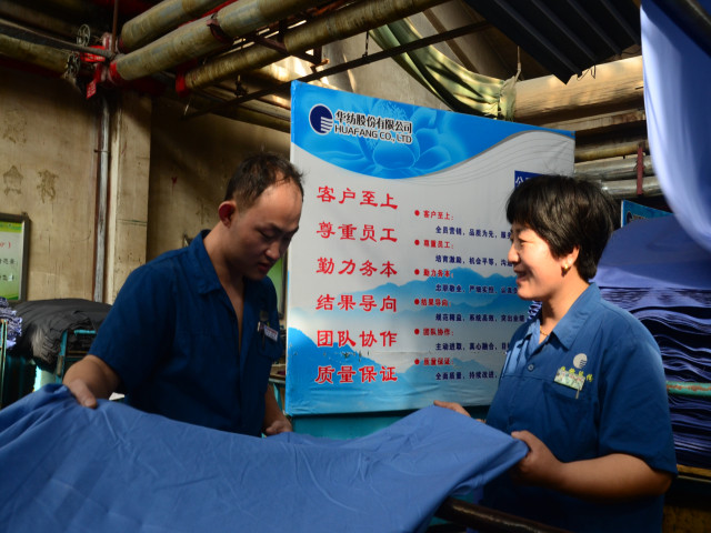 圖為面二車間甲班4#水洗機(jī)機(jī)長劉學(xué)濤(左)在與出檢工張海燕查看下機(jī)產(chǎn)品的質(zhì)量情況。